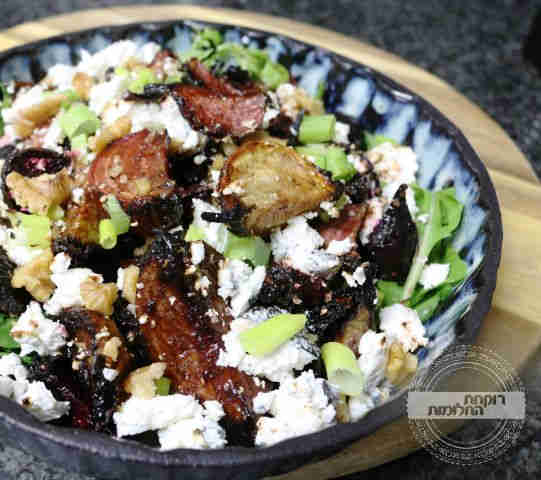4. מרכיבים את הסלט: בקערת הגשה מסדרים 3 שכבות של: עלי בייבי, בצל ירוק, סלקים, גבינה מפוררת (או חתוכה לקוביות) וחוזר חלילה פעמיים נוספות. מפזרים למעלה את אגוזי המלך וגרגרי הרימון (בעונה).