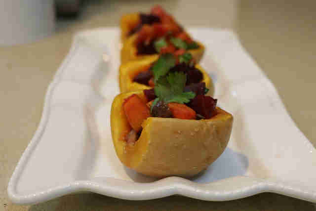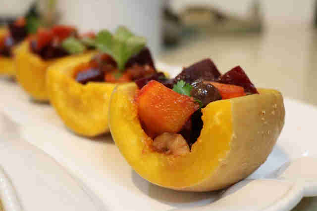 9. כאשר כל הירקות אפויים – מערבבים אותם בקערה (כדאי לעשות את זה מאוד בעדינות כדי שהסלק לא יצבע את כל הסלט…). מפוררים פנימה את הערמונים, מוסיפים את הרוטב ואת הכוסברה הקצוצה (שומרים כמה עלים לקישוט) ומערבבים (בעדינות, כן?)