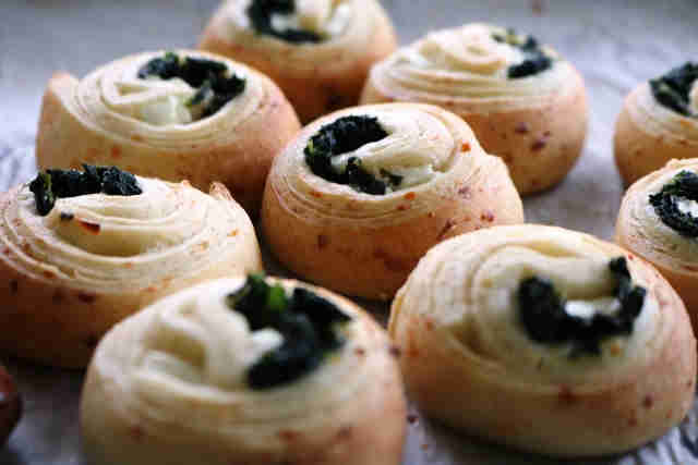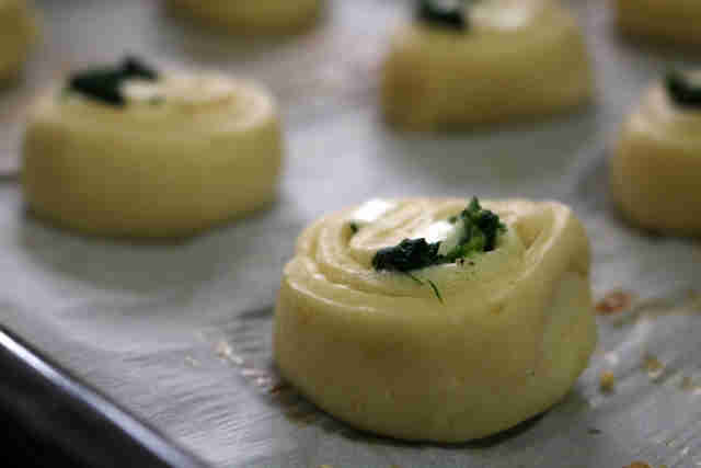מורחת כפית של ממרח עגבניות מיובשות ועליו מפזרים מעט גבינ"צ מגוררת (אני השתמשתי בקשקבל טובה). מגלגלים כרגיל ומעבירים לתבנית אפיה.