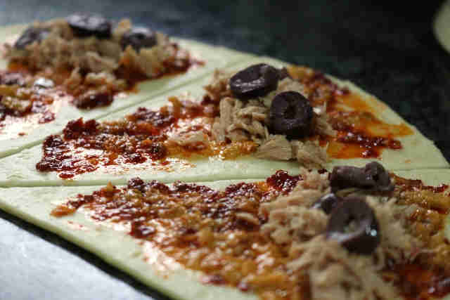 על כל משולש בצק אני מורחת 1/2 כפית אריסה טובה, 1/2 כפית לימון כבוש טחון/קצוץ, כף של טונה וחצי זית קצוץ , עדיף קלמטה. מגלגלת מהחלק הרחב לצר למעבירה לתבנית.