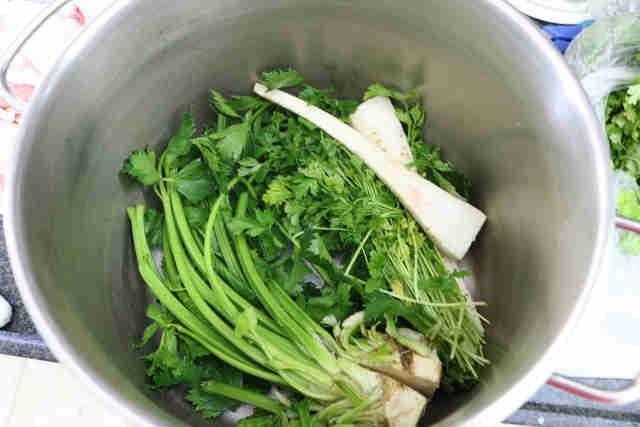 1. בסיר הכי גדול שיש לי אני מסדרת בתחתית שורש פטרוזיליה (מקולף וחצוי), שורש סלרי (כנ"ל), 1/2 צרור גדול (של שוק, לא ארוז של סופר) פטרוזיליה וחצי צרור כנ"ל שמיר.