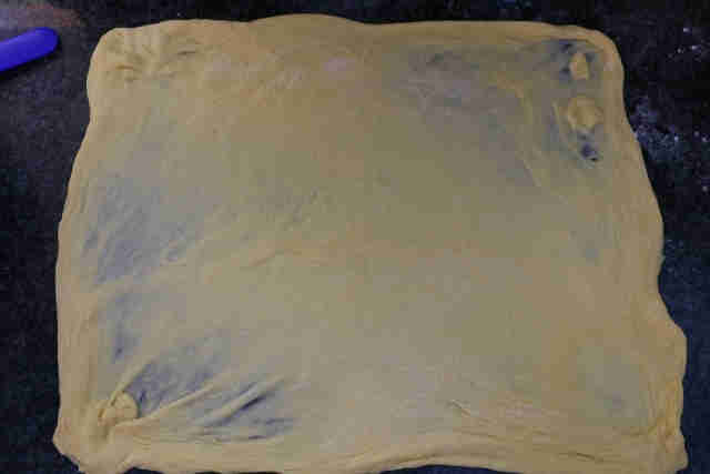 6. מקמחים קלות משטח עבודה ומרדדים חלק אחד של הבצק לצורה מלבנית בגודל 30*40 ס"מ בערך.