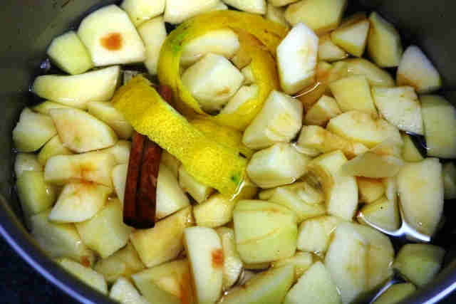 4. מביאים לרתיחה, ומבשלים 15-20 דקות (בודקים כבר אחרי 15 דקות, ולא מבשלים יותר מדי כדי שהתפוחים לא יתפוררו. (הבישול של הסמיט או האלכסנדר קצת יותר ארוך)