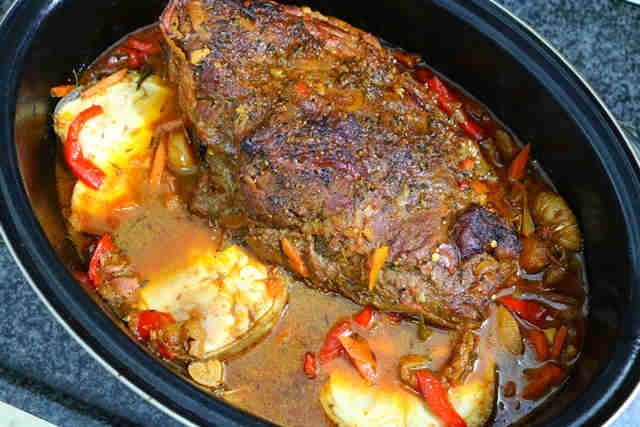 9 . מעבירים לתנור החם. משך הצליה תלוי בגודל הנתח. החל מ-3 שעות ואפילו עד 4 שעות. מדי חצי שעה פותחים, משקים את הבשר בנוזלים שסביבו, סוגרים וממשיכים בצליה. אחרי שעה אפשר להוסיף את העצמות. במידת הצורך - מוסיפים מעט נוזלים.