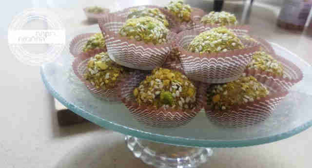 4. מכינים מהתערובת כדורים קטנים, 20 גר' לכדור, גודל של עגבניית שרי בערך. מגלגלים את הכדורים בתערובת הפיסטוק והשומשום. סה"כ יתקבלו כ-30 כדורים.